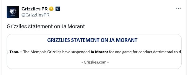 莫蘭特的一場(chǎng)禁賽將在明日對(duì)陣猛龍隊(duì)的比賽中執(zhí)行。